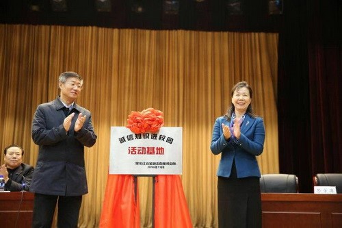 中国人民银行哈尔滨中心支行副行长那洪生为“征信知识进校园活动基地”揭牌
