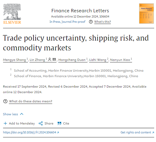 学校高度重视高层次人才的引进和培养,近一年来在高水平论文发表上取得了长足进展。近日,我校张林教授团队的商梦雅博士后在金融学国际顶级期刊Finance Research Letters (SSCI中科院二区TOP/JCR一区TOP期刊)上发表题为“Manuscript Title: Trade policy uncertainty, shipping risk and commodity markets: common and idiosyncratic volatility”的高水平学术论文,这是我校首次在该期刊上发表论文,标志着学校在发表高质量、高影响因子学术论文方面迈出关键一步。该论文第一署名单位为哈尔滨金融学院,由商梦雅(第一作者)、张林(通讯作者)和段洪成、王立志、肖南云合作完成。