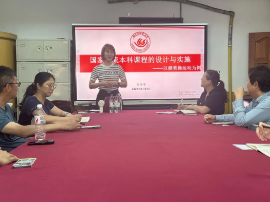 为深入推进体育教育教学改革,提升课程建设质量,6月23日下午14时,体育教研部在第二体育馆会议室组织开展了题为《国家级一流本科课程的设计与实施——以健美操运动为例》的专题讲座。讲座特邀哈尔滨师范大学教授肖宁宁为与会教师讲解国家级一流本科课程的建设过程,体育教研部副主任杨国红主持讲座,部门全体教师参加讲座。
