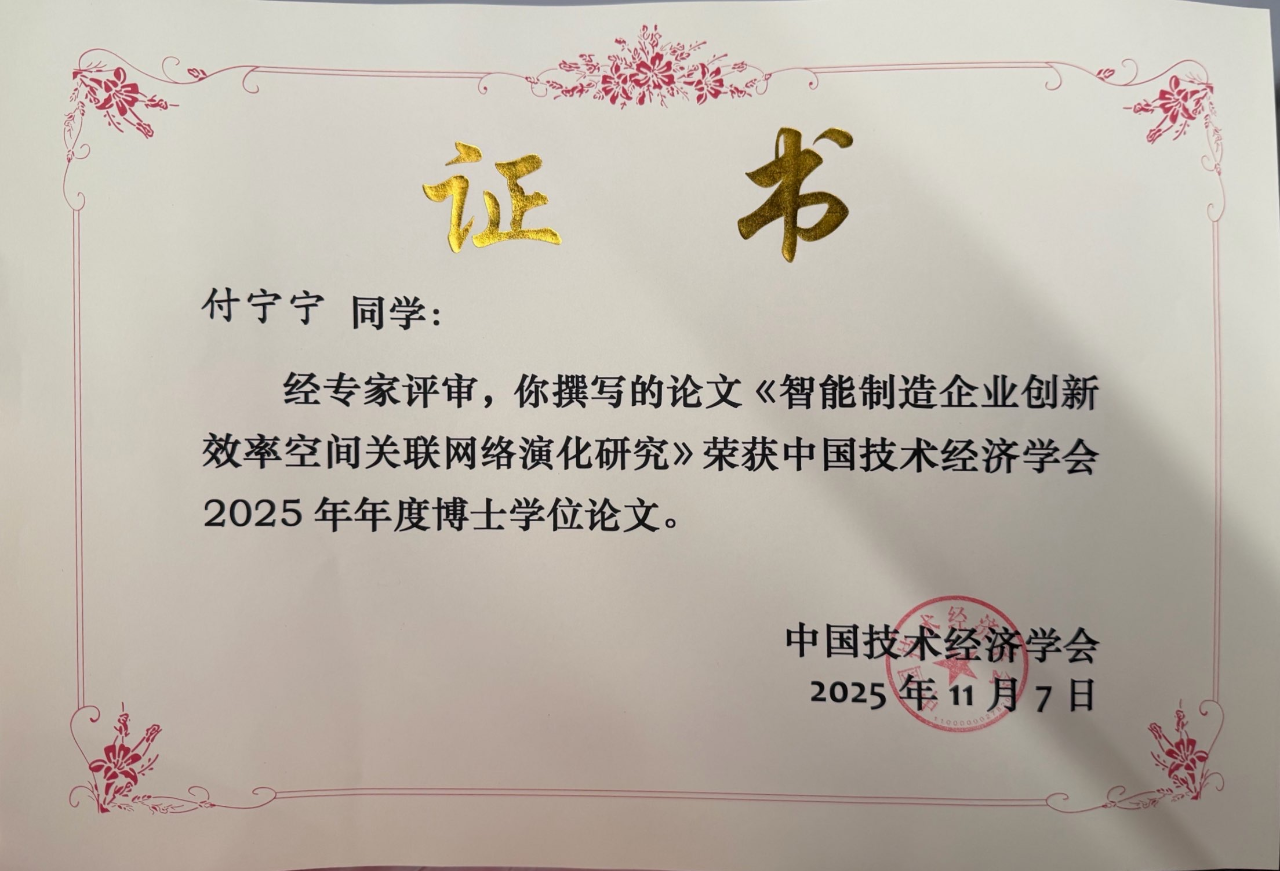 我校付宁宁老师荣获中国技术经济学会2025年年度博士学位论文奖