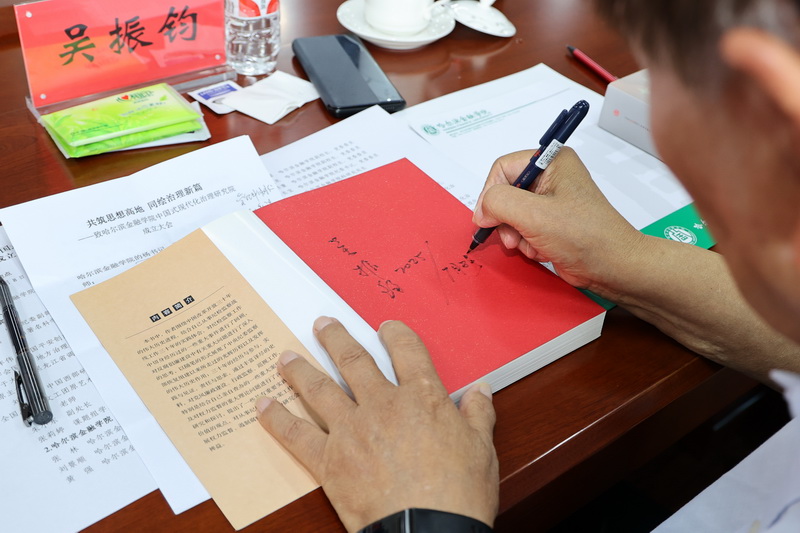 聘任仪式结束后,吴振钧向研究院赠送了学术著作,为研究院的学术研究提供了宝贵参考。吴振钧在讲话中对研究院的成立表示祝贺,感谢学校的信任,并承诺将积极分享研究心得、贡献资源,与同仁共同聚焦重大治理命题。他对研究院提出三点期望:一是立足实践,扎根中国现代化进程,紧密围绕国家与区域需求,提炼 “中国经验”,为决策提供有力服务;二是融合育人,将研究院打造成培育未来治理精英的摇篮,积极推动产教研融合,助力青年人才成长;三是构建开放格局,搭建跨学科、跨院校、跨领域的协同网络,提升中国治理话语的国际影响力。